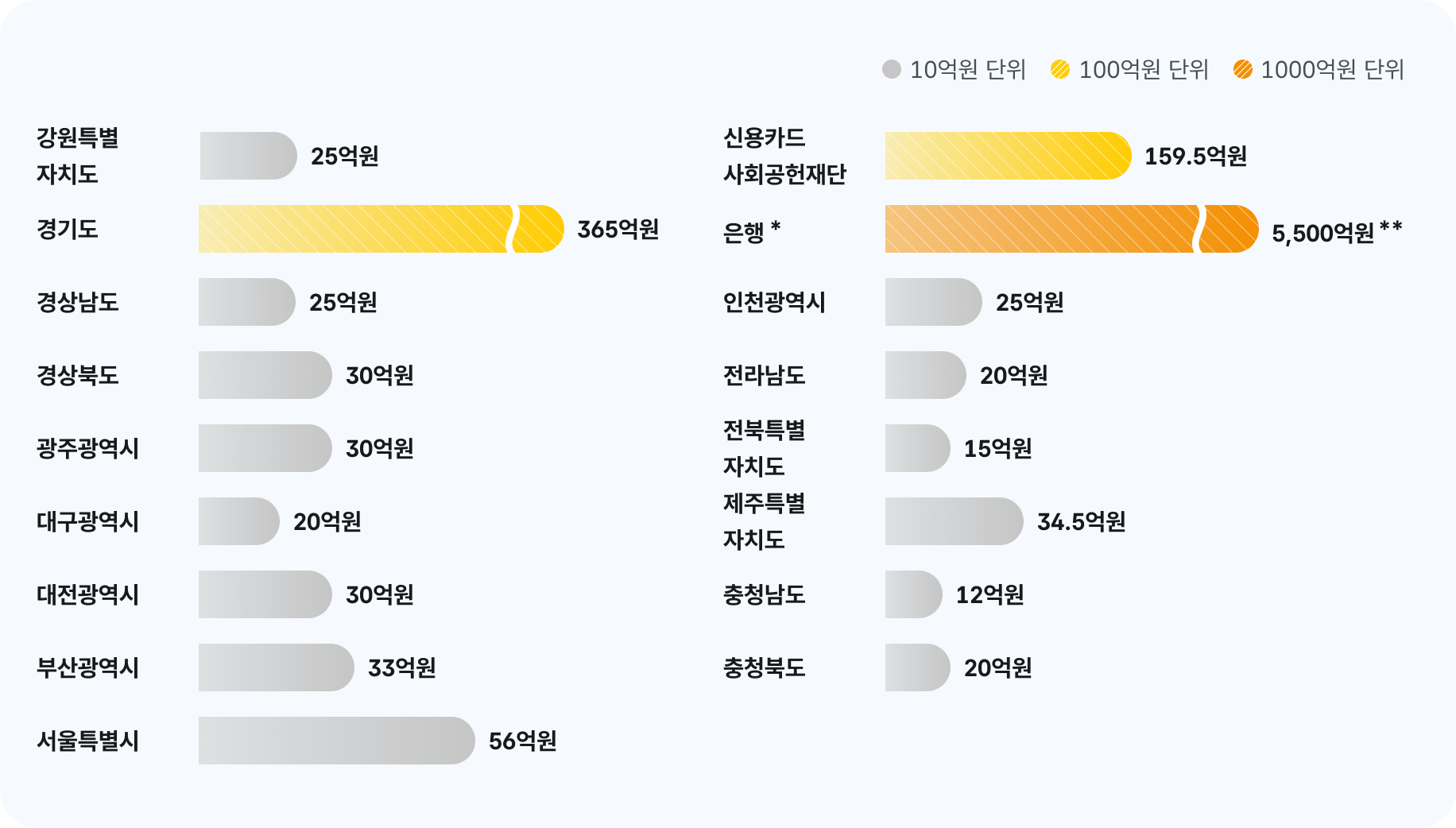 금융회사, 일반기업, 개인 및 단체 등의 기부로 이루어진 기부금과 지방자치단체 등의 차입금으로 조성되어 있습니다.